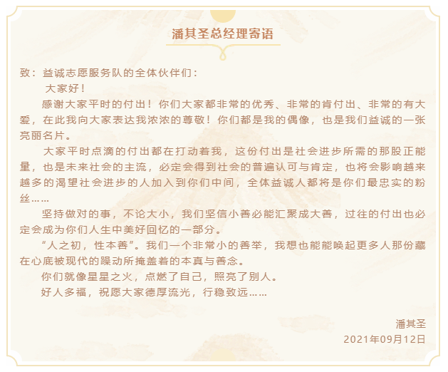 本次團(tuán)建活動(dòng)結(jié)束后,潘其圣總經(jīng)理特寄語全體志愿者伙伴,勉勵(lì)大家德厚流光,行穩(wěn)致遠(yuǎn):